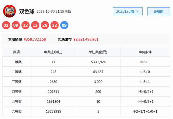 双色球第2025125期开奖号码为:03、09、12、13、26、32+09。其中红球三区比为2:2:2,奇偶比为3:3,莫得开出重号,蓝球出当前第三区。