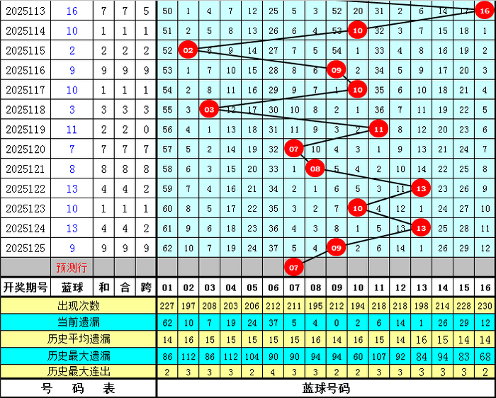 蓝球分析【一区01-04,二区05-08,三区09-12,四区13-16】:上期蓝球为09,出当前第三区,近50期区间比为7:15:11:17,近10期区间比为1:2:5:2,本期瞻望蓝球出当前第二区,保举蓝球07。