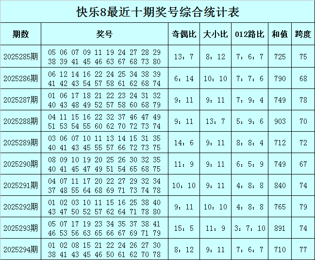福彩清翠8第2025294期开出奖号:01 02 08 15 21 22 24 26 27 30 38 41 43 45 46 50 61 62 70 78,其中奖号奇偶比开出8:12,大小比开出9:11,和值开出710,跨度开出77,012路比开出7:6:7。